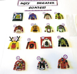 Oh what fun we have in the Robson Ranch Fused Glass Club (RRFGC)! On Dec. 2, 2025, our club had our annual meeting and to reveal the winner of our Ugly Sweater contest. No, we did not have to dress the part. Inspired by our very creative member, Connie Drew, a contest was put in place several weeks before for members to create Ugly Sweater ornaments. The ornaments were fun, colorful, and just plain laughable. Votes were cast by Creative Art members not associated with the RRFGC. Check out the board of entries. Entry number 1 captured the crown and indeed captured the spirit of the season! Congratulations to Rae Duggan for her very imaginative and ugly sweater ornament!