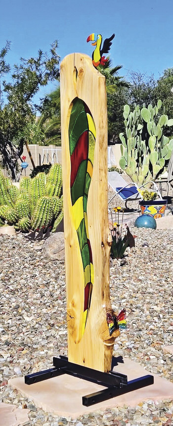 ← Feather in wood with parrot and butterfly by Marita Hickman and Mark Lewis