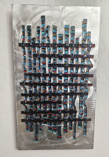 ← Stainless steel with strips of blue and black glass by Nancy Nesbitt